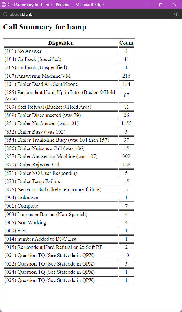 This is particularly useful when the Resolved column shows a high number -- the pop-up lets you quickly see which specific resolved codes are driving that count (for example, a spike in disconnected numbers, wrong numbers, or fax tones) without having to pull a separate report.