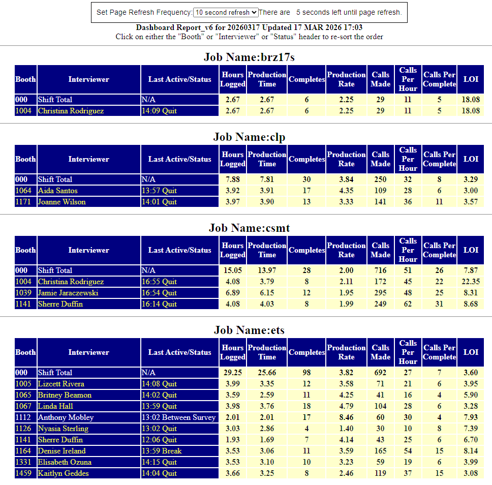 The Interviewer Dashboard (INTVDash) is a real-time monitoring tool that displays live calling activity broken down by interviewer, for every active project currently running on the phone room floor. It is accessible to anyone on the internal network and requires no login.