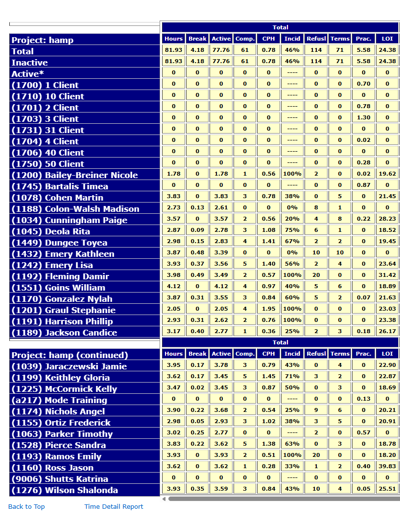 Below the summary, each active project has its own table. These tables break down production to the individual interviewer level.