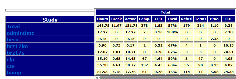 | LOI | Average Length of Interview, in minutes. Based on completed surveys only. Measures true survey time from introduction to last question -- does not include dialing or wrap-up time. Total section only -- not shown in the hourly columns. | Yes | No |