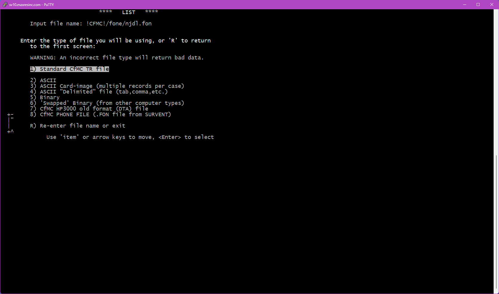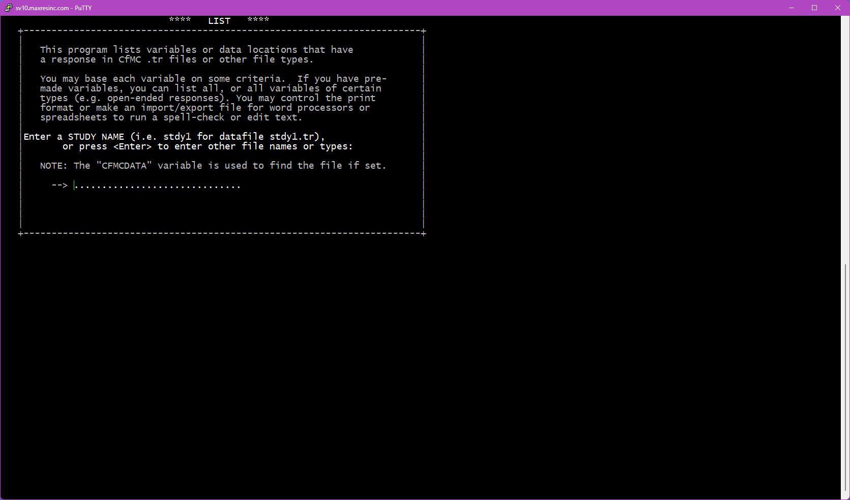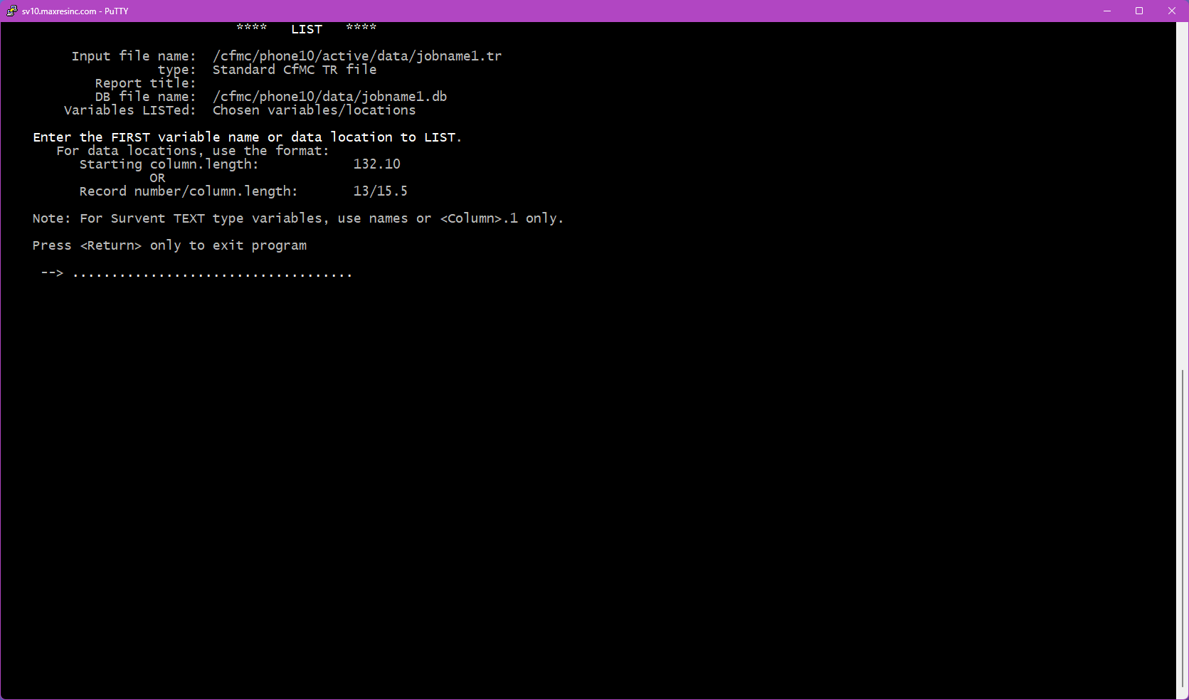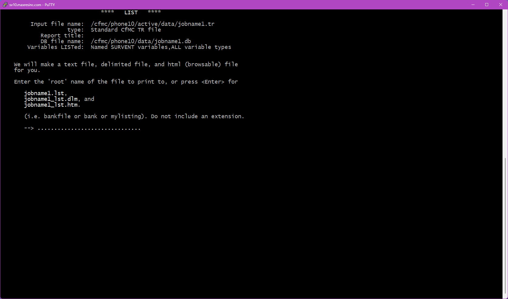 The first screen asks for a datafile name. By default, LIST looks in the $CFMC/data folder for whatever filename you enter here.