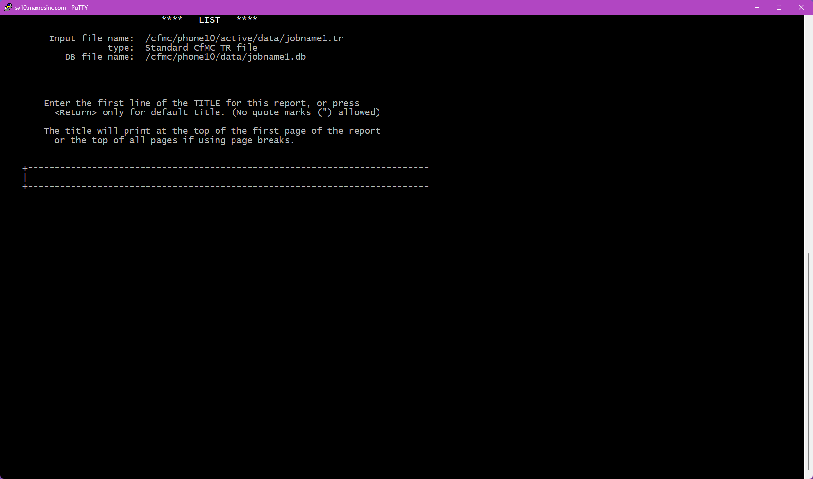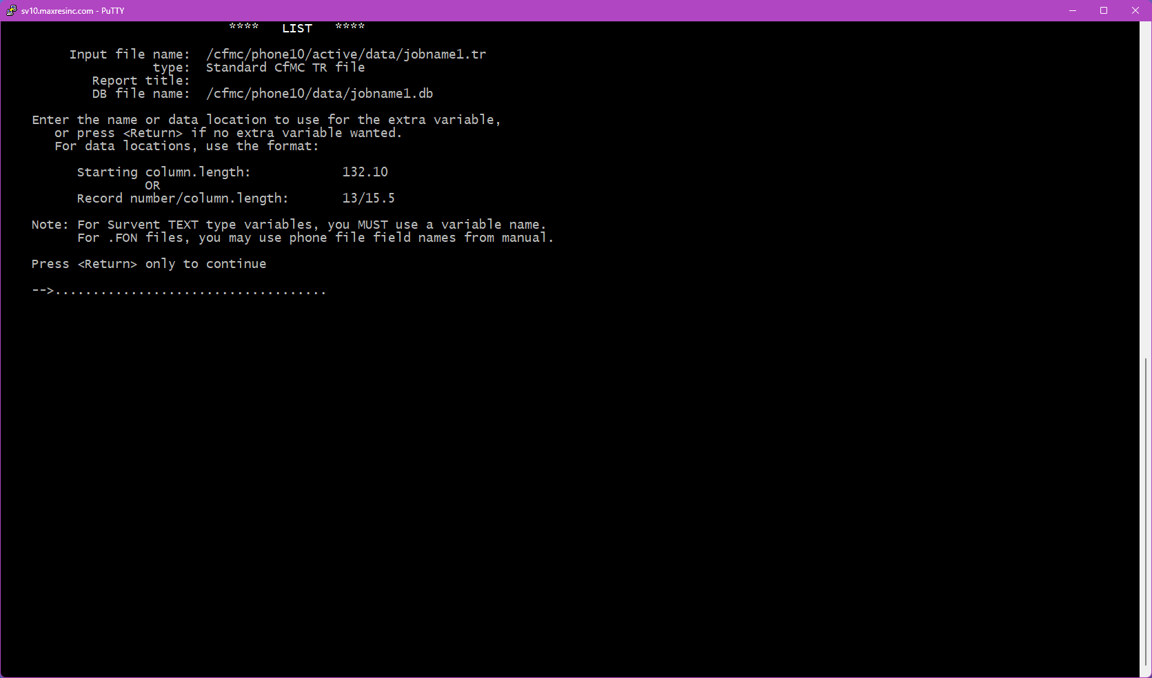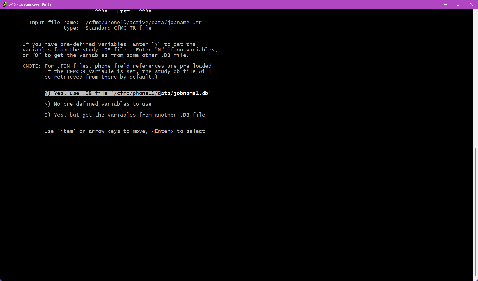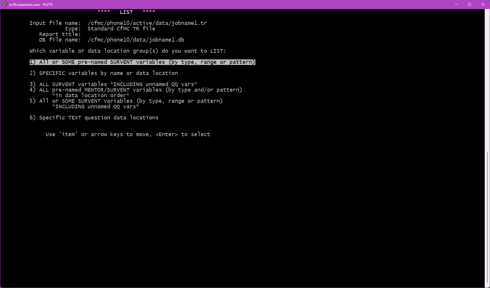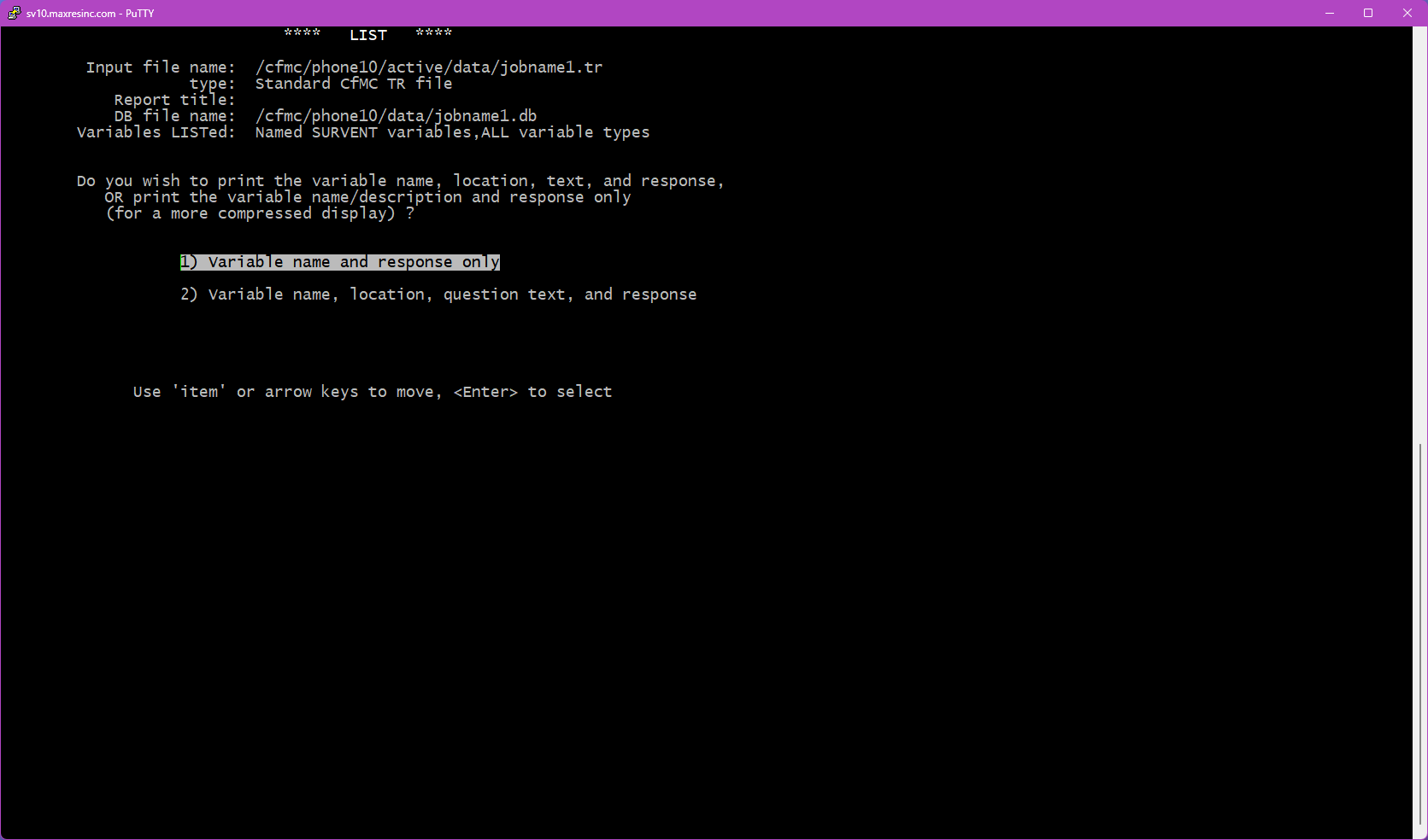 The first screen asks for a datafile name. By default, LIST looks in the $CFMC/data folder for whatever filename you enter here.