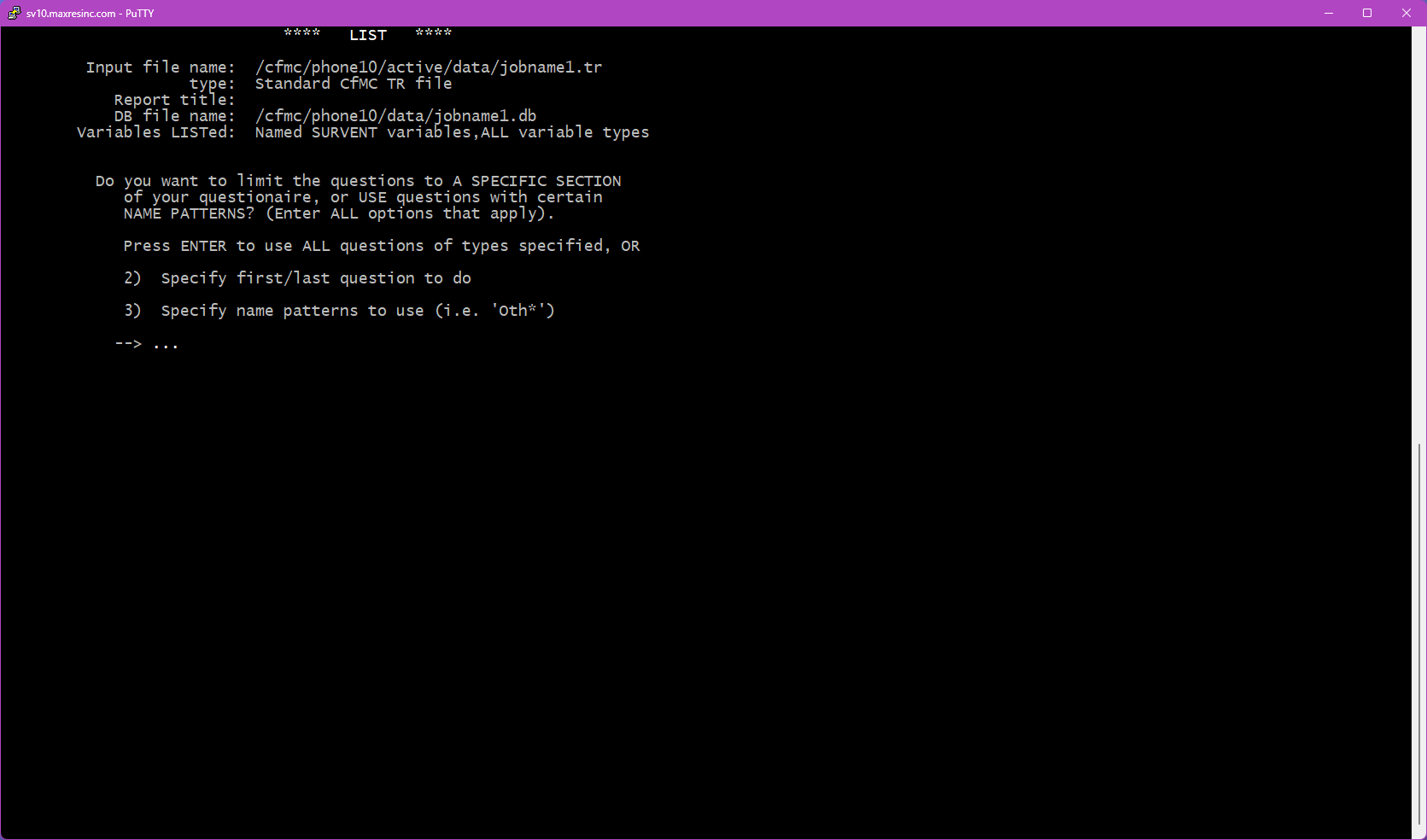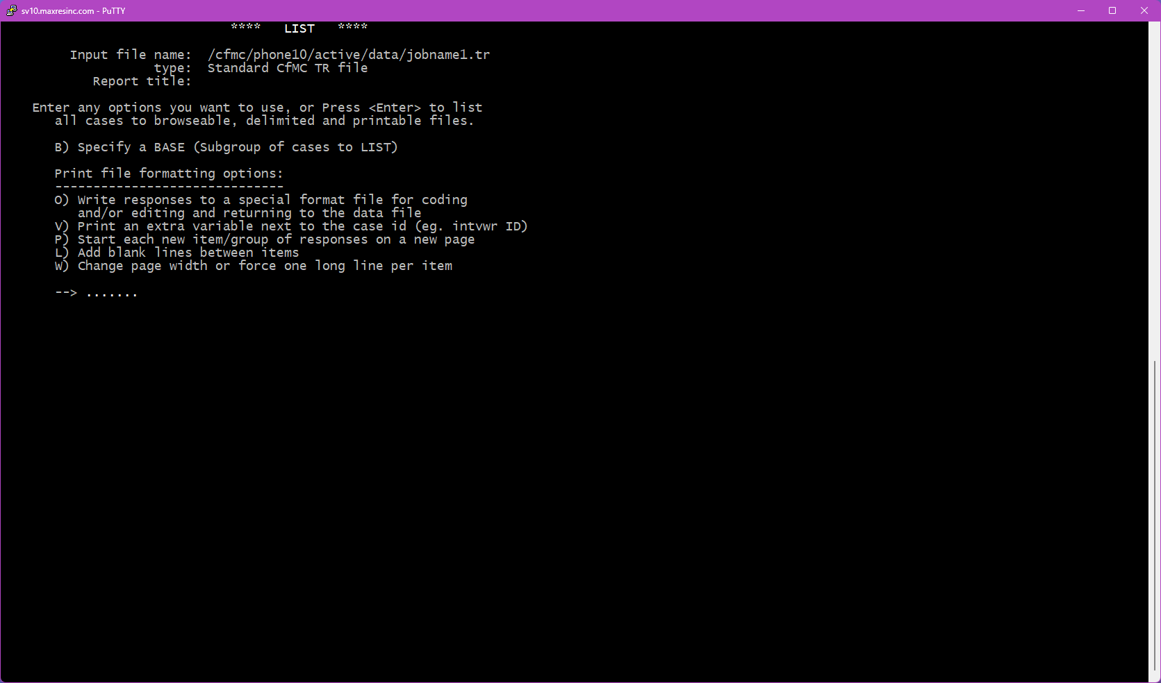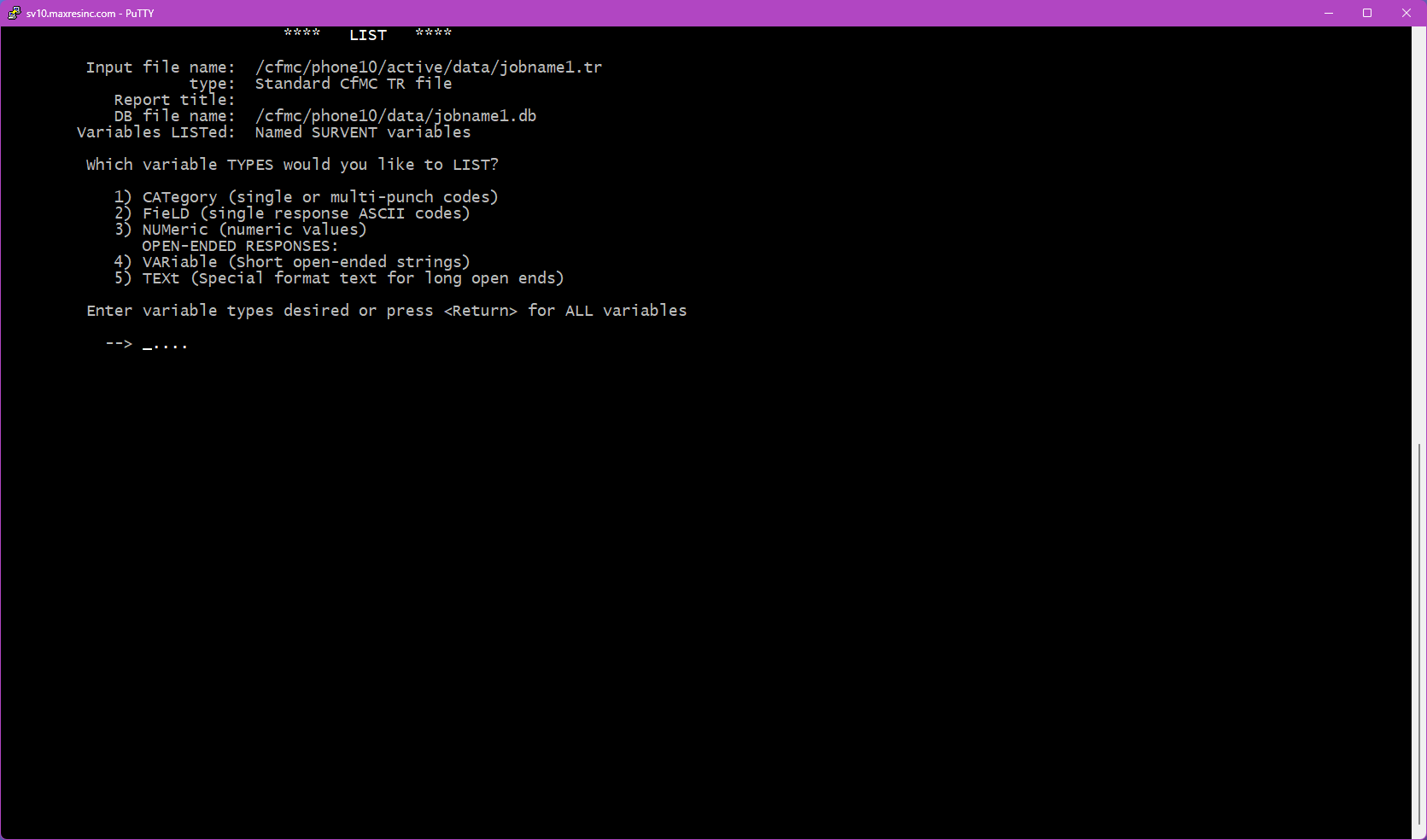 LIST is a built-in Survox utility used to view and extract data directly from the command line via PuTTY. It allows staff to inspect data files, fone files, subset files, and coded files at any point during a project -- without needing to generate a formal report or run a full data dump.