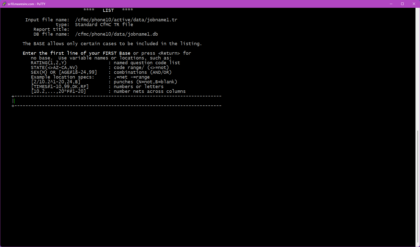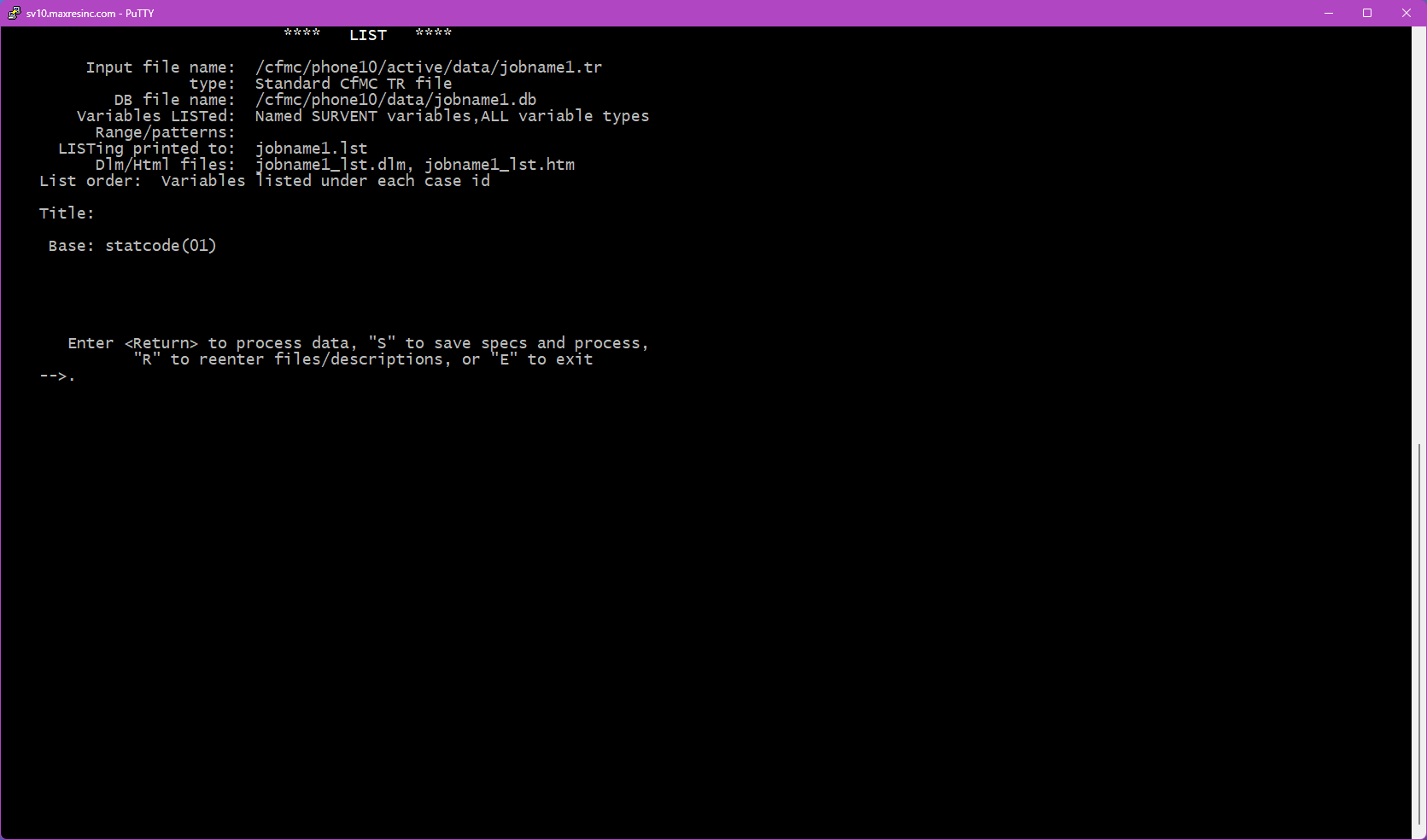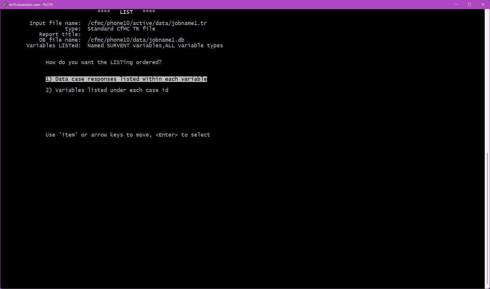 LIST is a built-in Survox utility used to view and extract data directly from the command line via PuTTY. It allows staff to inspect data files, fone files, subset files, and coded files at any point during a project -- without needing to generate a formal report or run a full data dump.