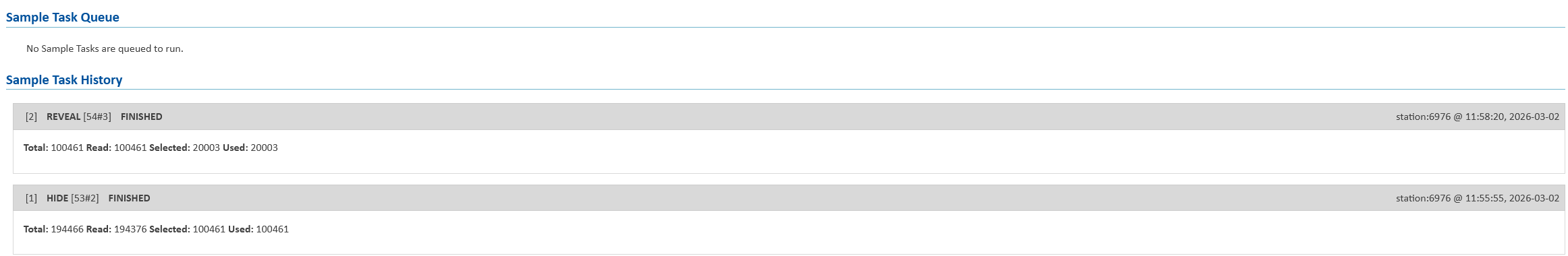 Unlike foneutil and via a super/boss, the console will not immediately let you know how many records were affected. Instead, you need to navigate to the Sample Task Queue to view the status/result. Just like with the hide/reveal, first select the project and Live and then it will appear. It should look similar to the below image:
