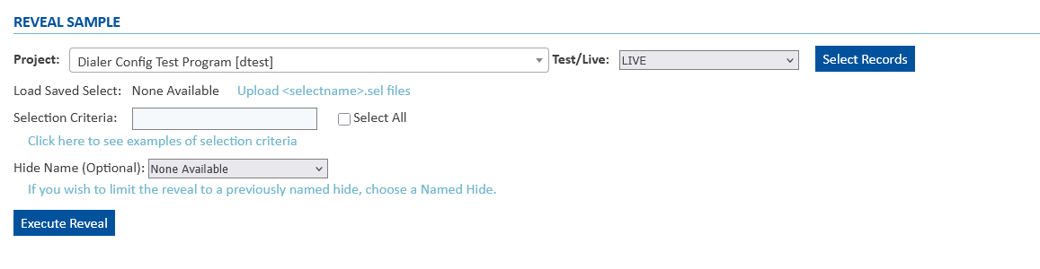 - Select All: Optionally, checking this INSTEAD of providing a select statement will do as it says, and reveal ALL hidden sample