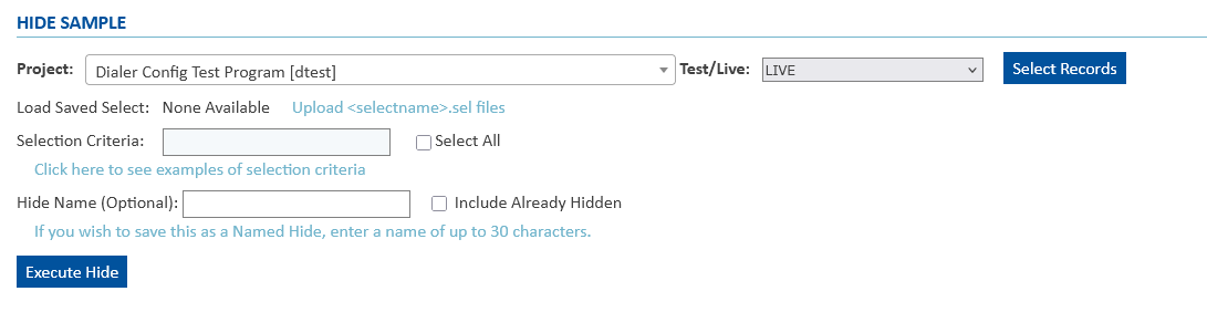 - Select All: Optionally, checking this INSTEAD of providing a select statement will do as it says, and hide ALL non-hidden sample