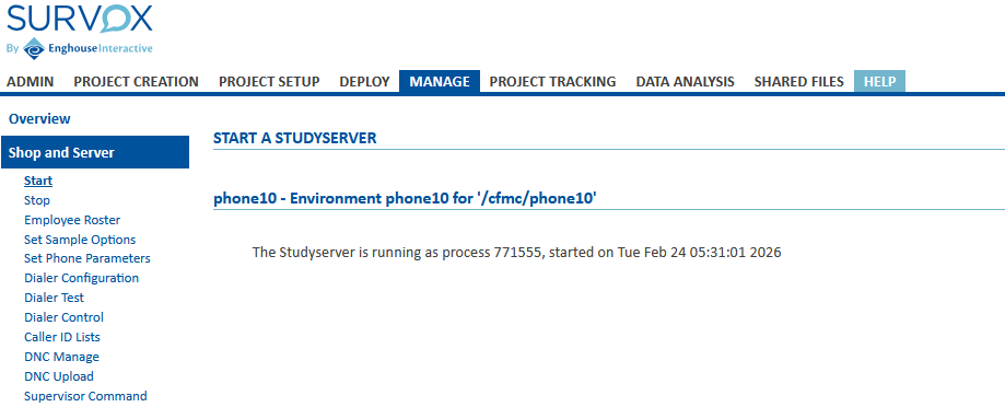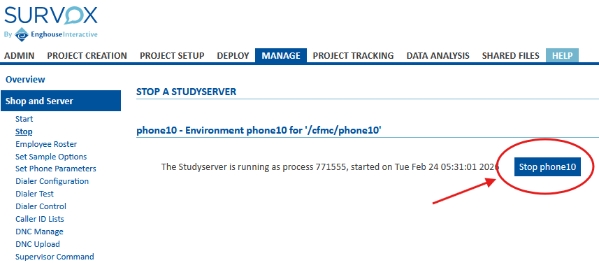 - Once logged in, navigate to Manage -> Shop & Server -> Stop - This is a safety check to make sure the Console doesn't think it is still running. If you see a Process ID showing, with a date/timestamp and "Stop Phone10" like below, that means the Console thinks the study server is still running, so only proceed if you are 100% sure the server is crashed or needs to be "bounced".