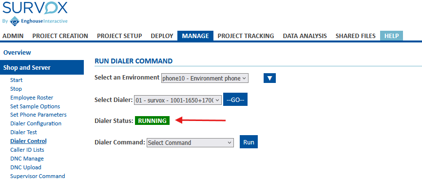 - From the Survox Console, navigate to Manage -> Shop & Server -> Dialer Control and simply click the blue "Go" button to see the dialer's current status